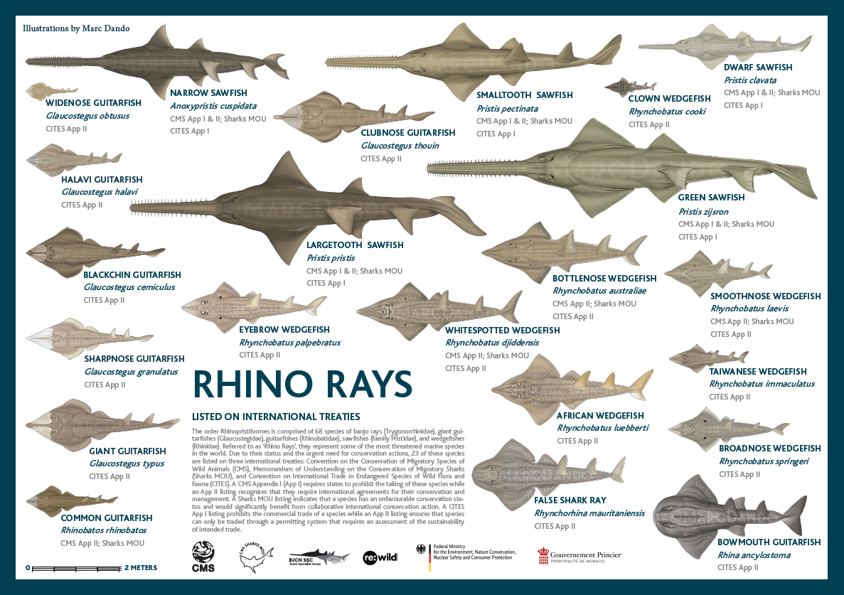 The order Rhinopristiformes is comprised of 68 species of banjo rays (Trygonorrhinidae), giant gui-tarfishes (Glaucostegidae), guitarfishes (Rhinobatidae), sawfishes (family Pristidae), and wedgefishes (Rhinidae). Referred to as ‘Rhino Rays’, they represent some of the most threatened marine species in the world. Due to their status and the urgent need for conservation actions, 23 of these species are listed on three international treaties: Convention on the Conservation of Migratory Species of Wild Animals (CMS), Memorandum of Understanding on the Conservation of Migratory Sharks (Sharks MOU), and Convention on International Trade in Endangered Species of Wild Flora and Fauna (CITES). A CMS Appendix I (App I) requires states to prohibit the taking of these species while an App II listing recognizes that they require international agreements for their conservation and management. A Sharks MOU listing indicates that a species has an unfavourable conservation status and would significantly benefit from collaborative international conservation action. A CITES App I listing prohibits the commercial trade of a species while an App II listing ensures that species can only be traded through a permitting system that requires an assessment of the sustainability of intended trade.