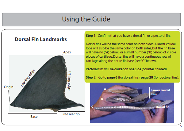 This field guide has been designed to assist in identification of shark fins, based on morphological characteristics of the fin (i.e. fin color, distinct markings, fin shape) to be used by wildlife inspectors, customs personnel, researchers and fishers to provisionally identify detached, dried, unprocessed dorsal and pectoral fins from Large Coastal Sharks (LCS) and Pelagic Sharks that are common in the U.S. Atlantic Ocean, including the Gulf of Mexico. This guide is intended to enable provisional field identification of fins, establishing probable cause to hold fins for expert examination or DNA-testing.